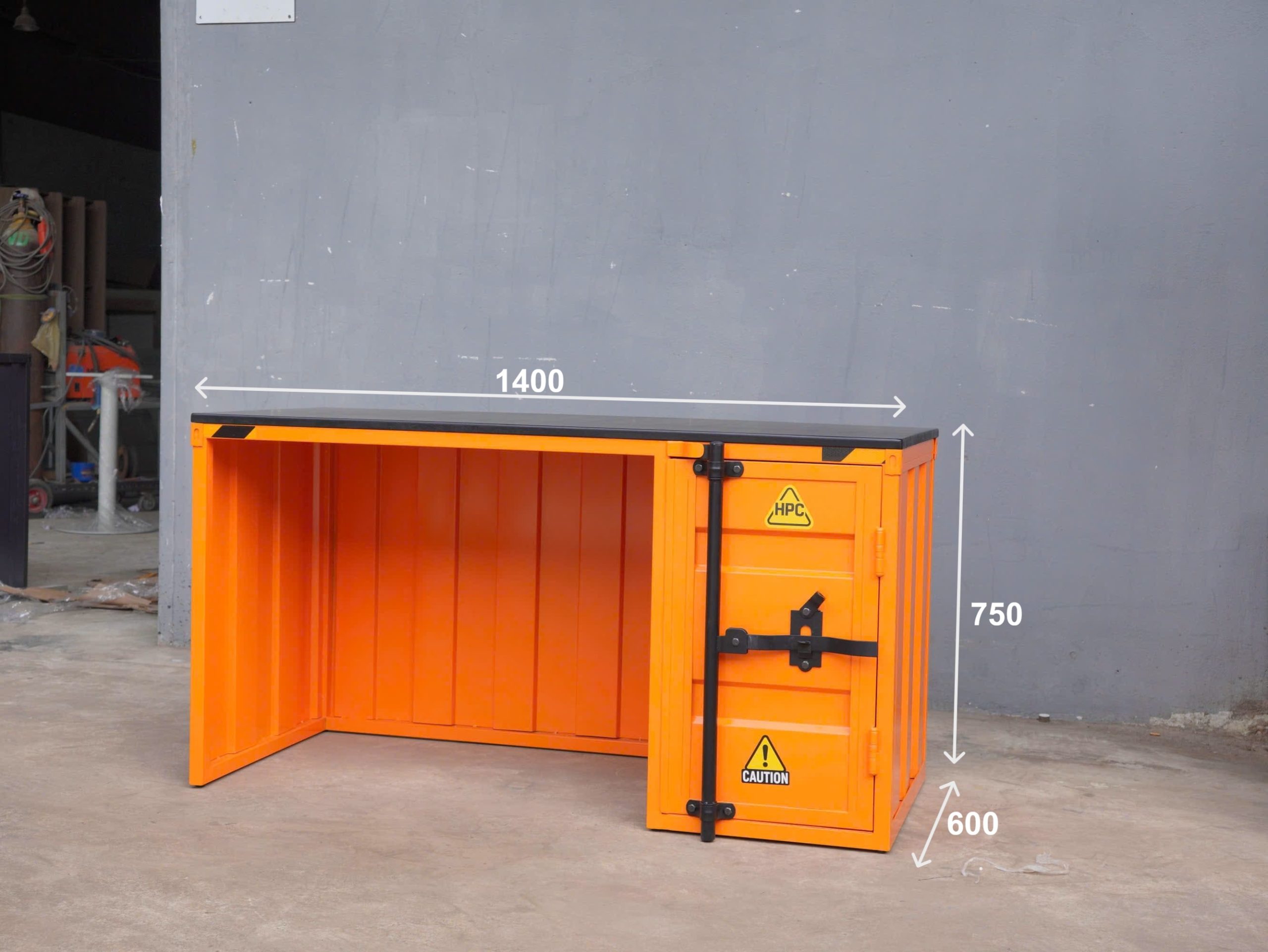 Bàn làm việc phong cách container • Chất liệu: Thân tủ bằng thép dày, sơn tĩnh điện chống gỉ, chịu lực tốt, dùng lâu vẫn bền màu. • Mặt tủ: Gỗ cao su tự nhiên, xử lý nhẵn mịn, phủ sơn PU màu đen mờ, tăng thêm độ bền chống thấm. • Thiết kế: Mô phỏng kết cấu container với chi tiết bản lề, chốt khóa, tem cảnh báo và mã hiệu HPC độc quyền – tạo điểm nhấn cá tính trong mọi không gian. • Công năng: Kích thước nhỏ gọn, dễ dàng đặt ở phòng khách, phòng làm việc, quán cà phê hoặc studio • Màu sắc đa dạng: Có thể phối theo tone xanh – đen, hoặc đặt làm theo màu riêng phù hợp không gian của bạn. 👉 Một món đồ decor đậm chất industrial, vừa gọn, vừa độc đáo – phù hợp với những ai thích sự khác biệt trong từng chi tiết.
