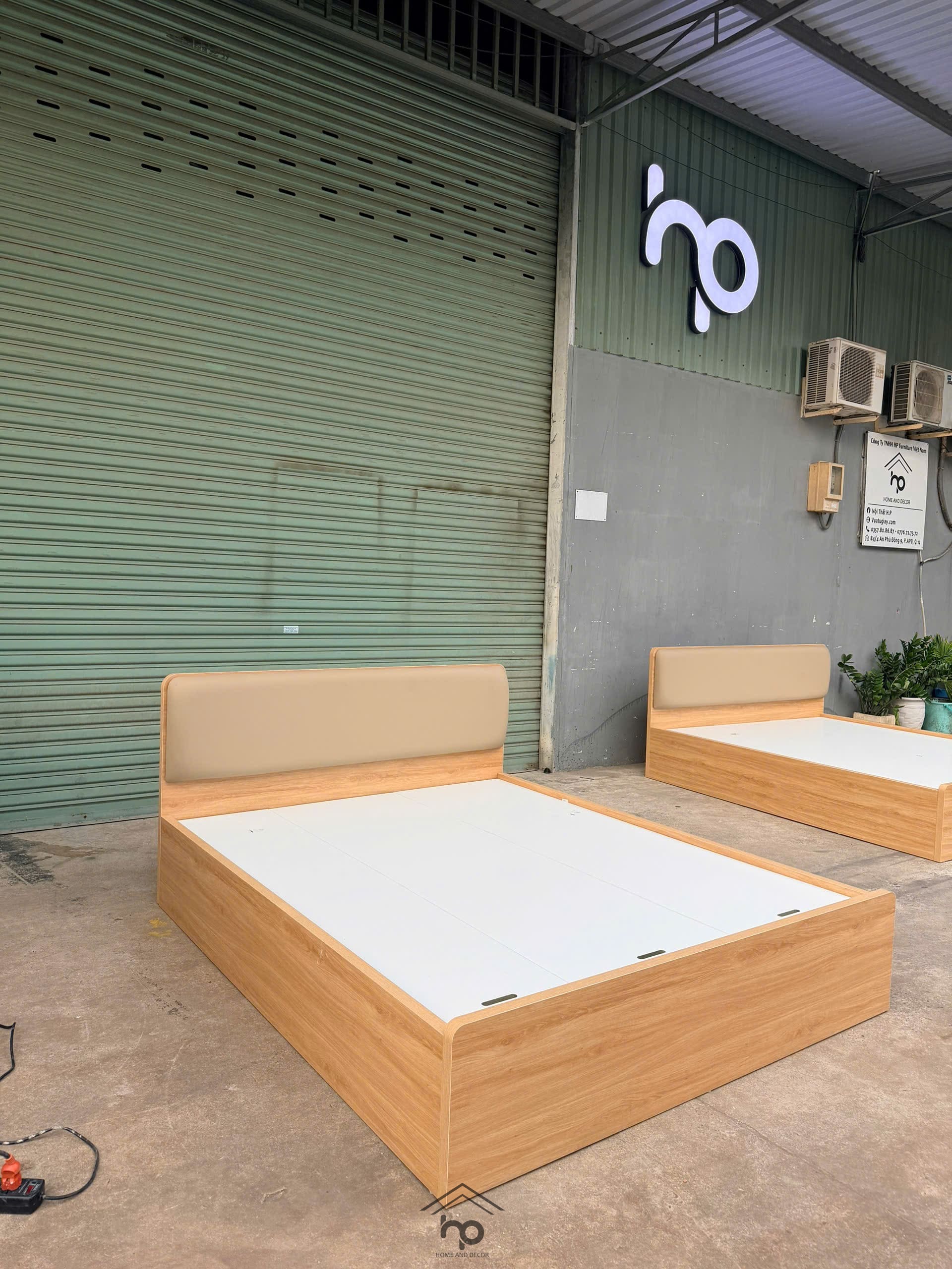 Giường bệt MDF 1m6x2m màu sồi 388, không ngăn kéo, đầu giường bọc nệm da kem dày 8cm, vạt 18mm chắc chắn, thiết kế tối giản, hiện đại.