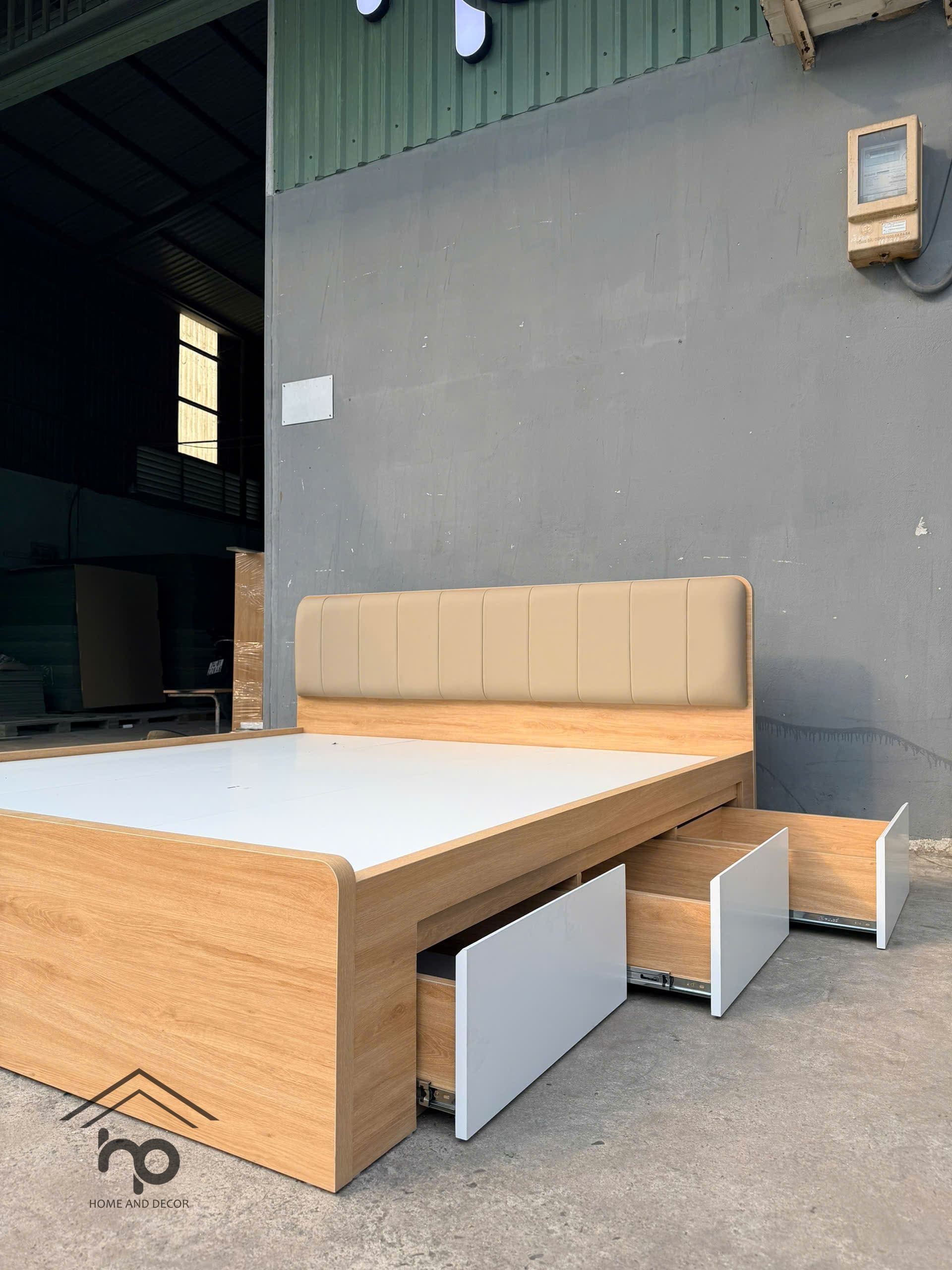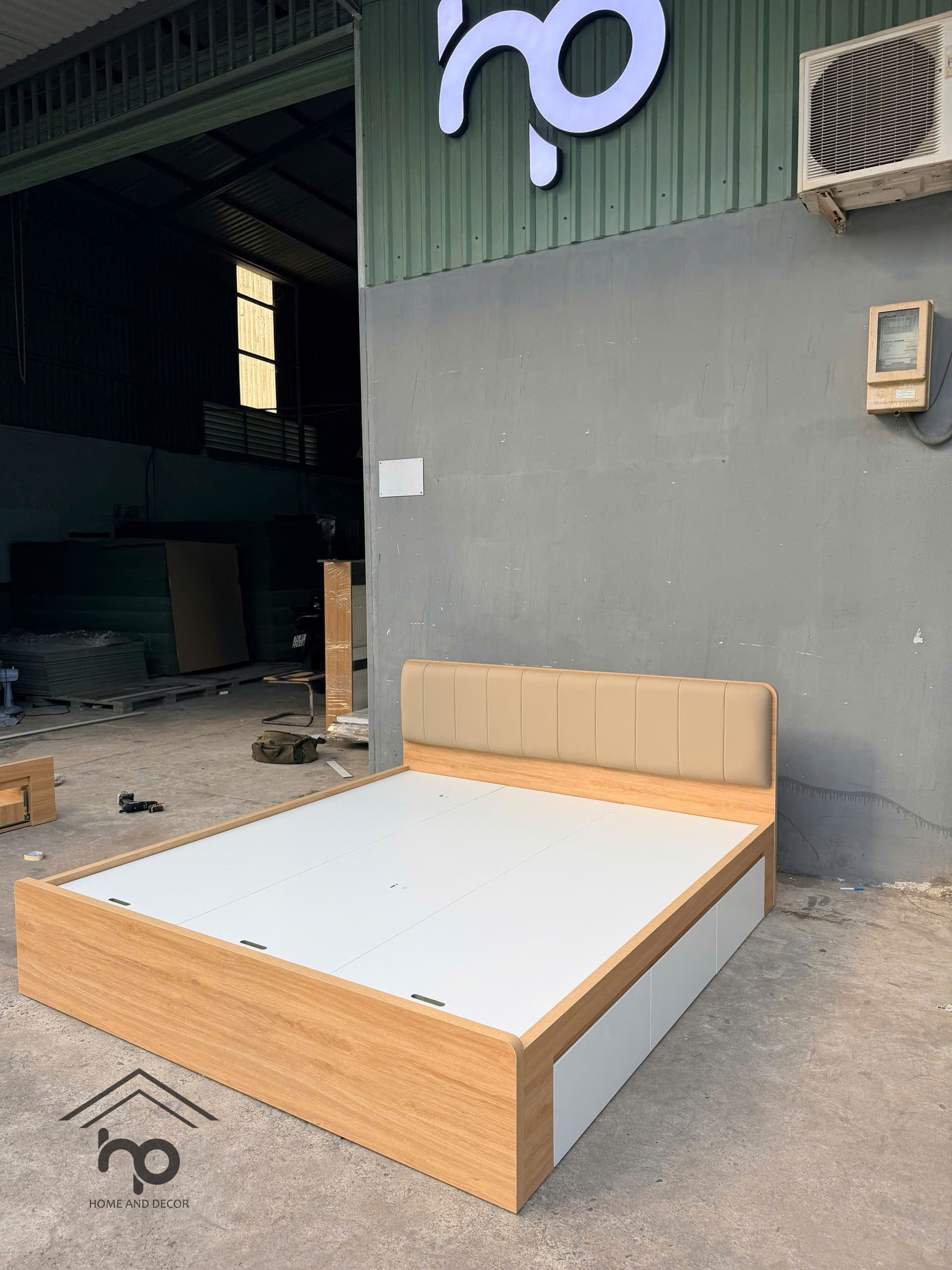 Giường bệt MDF 1m8x2m màu sồi 388, 3 ngăn kéo, đầu giường bọc nệm da kem dày 8cm, vạt 18mm chắc chắn, thiết kế hiện đại, tiện nghi.