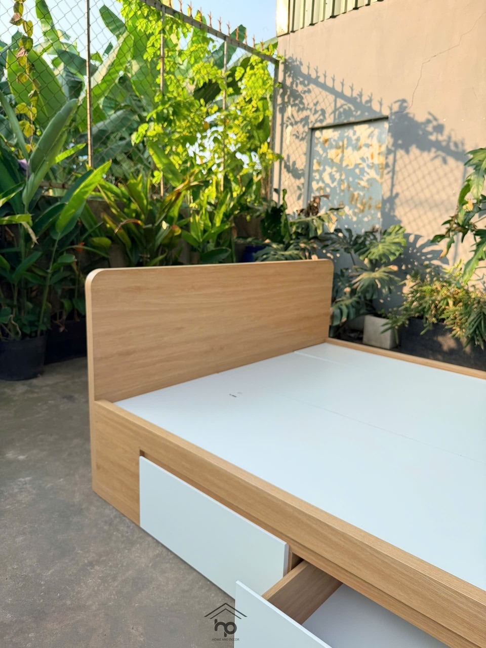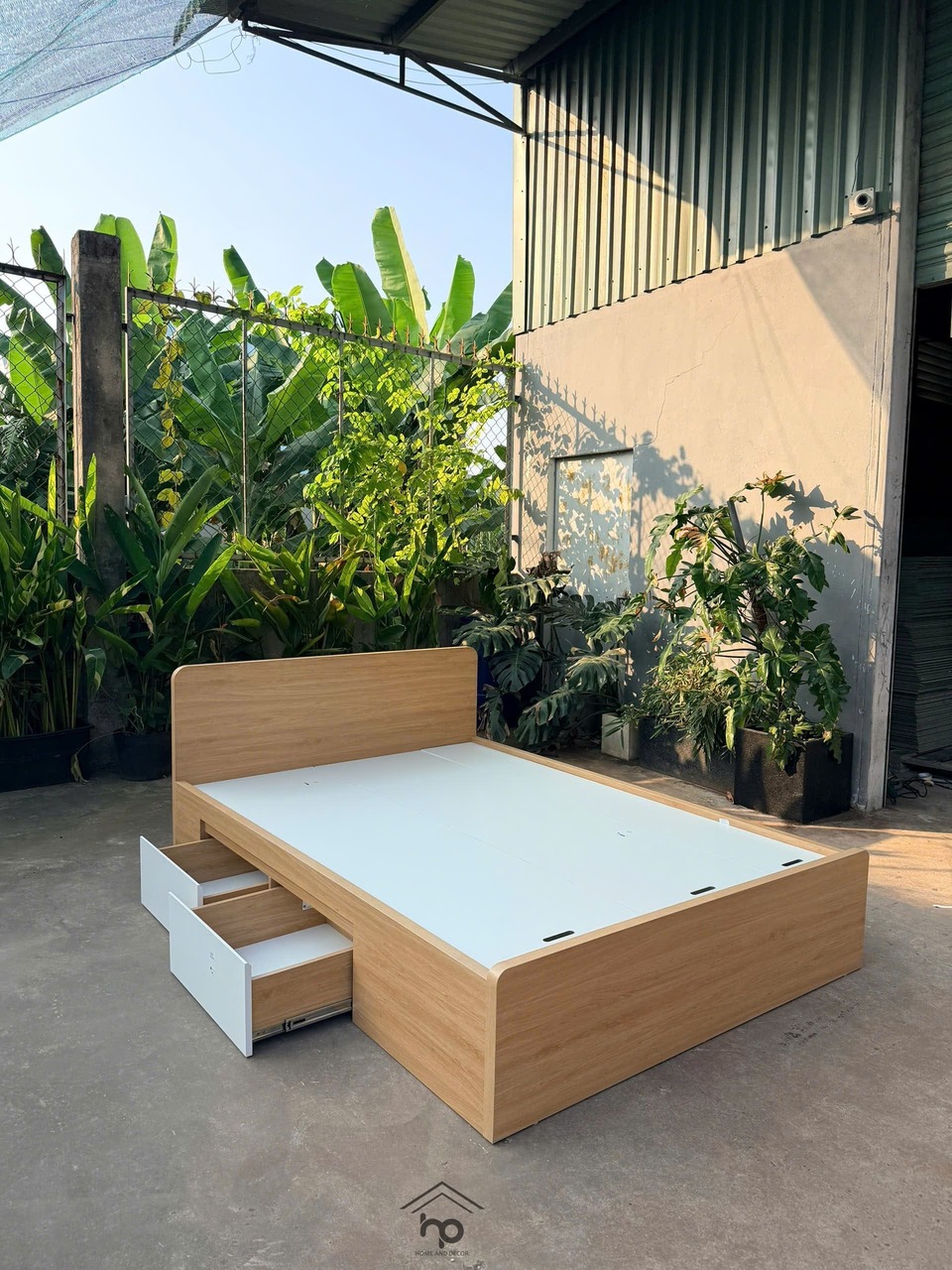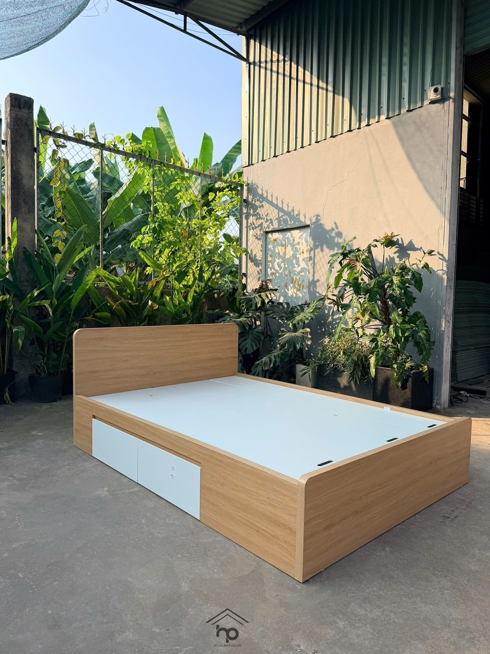 Giường ngủ 1m4 MDF chống ẩm màu sồi phối trắng – 2 ngăn kéo tiện dụng, thiết kế hiện đại