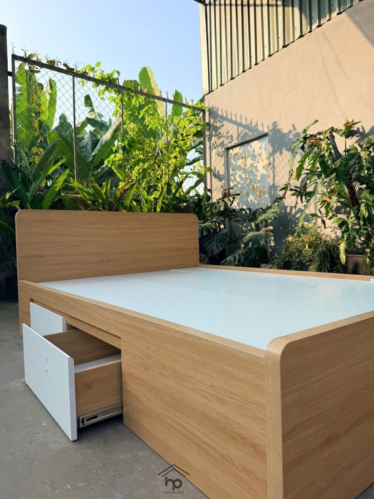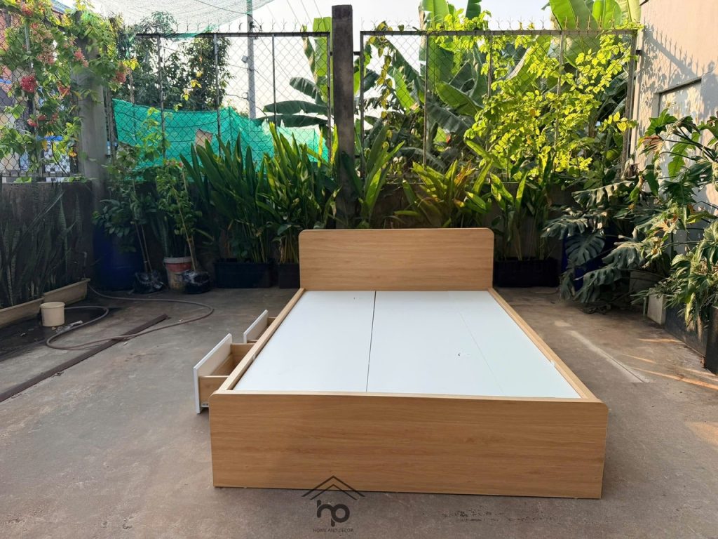• Khung giường: Gỗ MDF lõi xanh chống ẩm phủ Melamine màu sồi