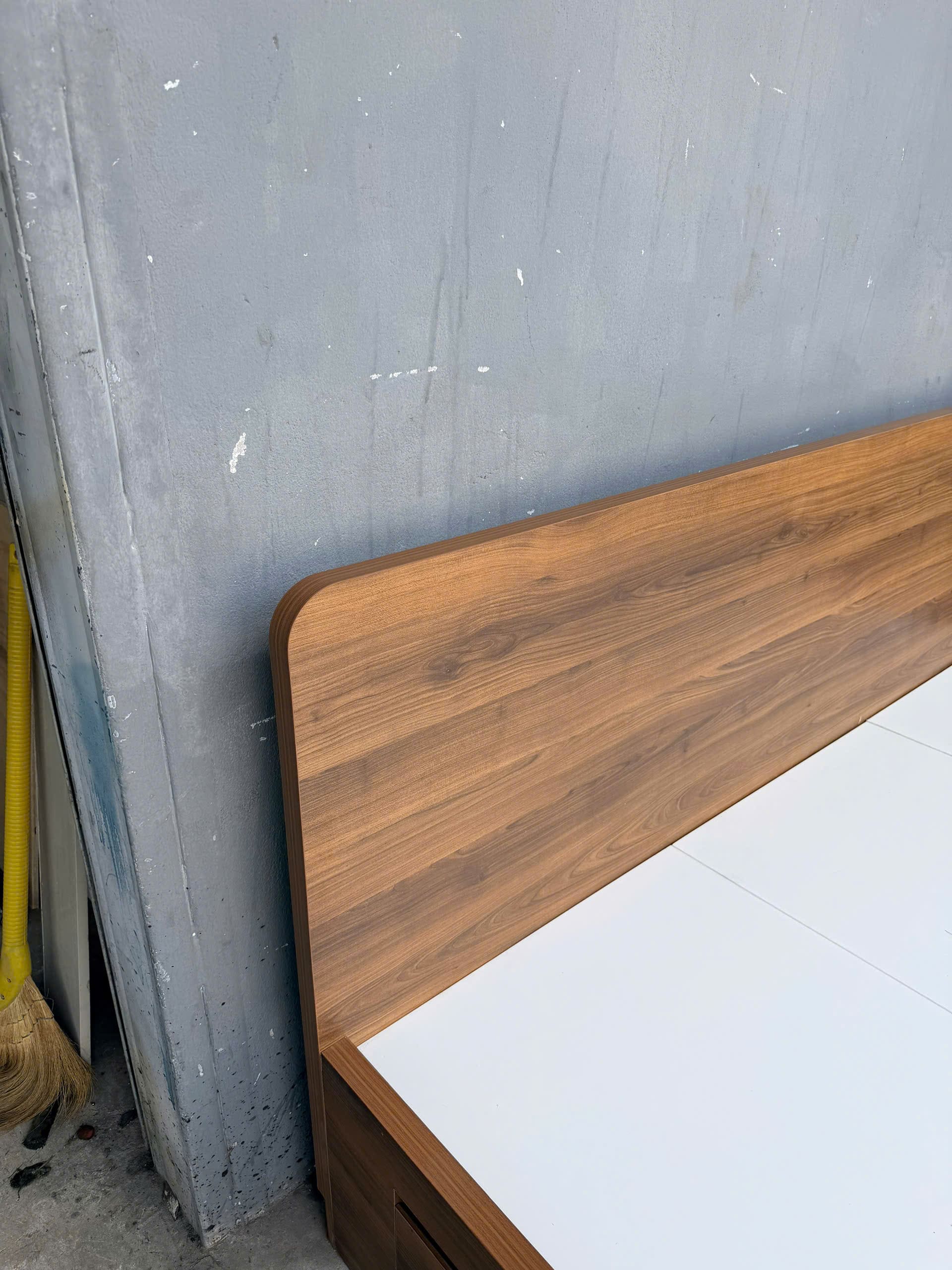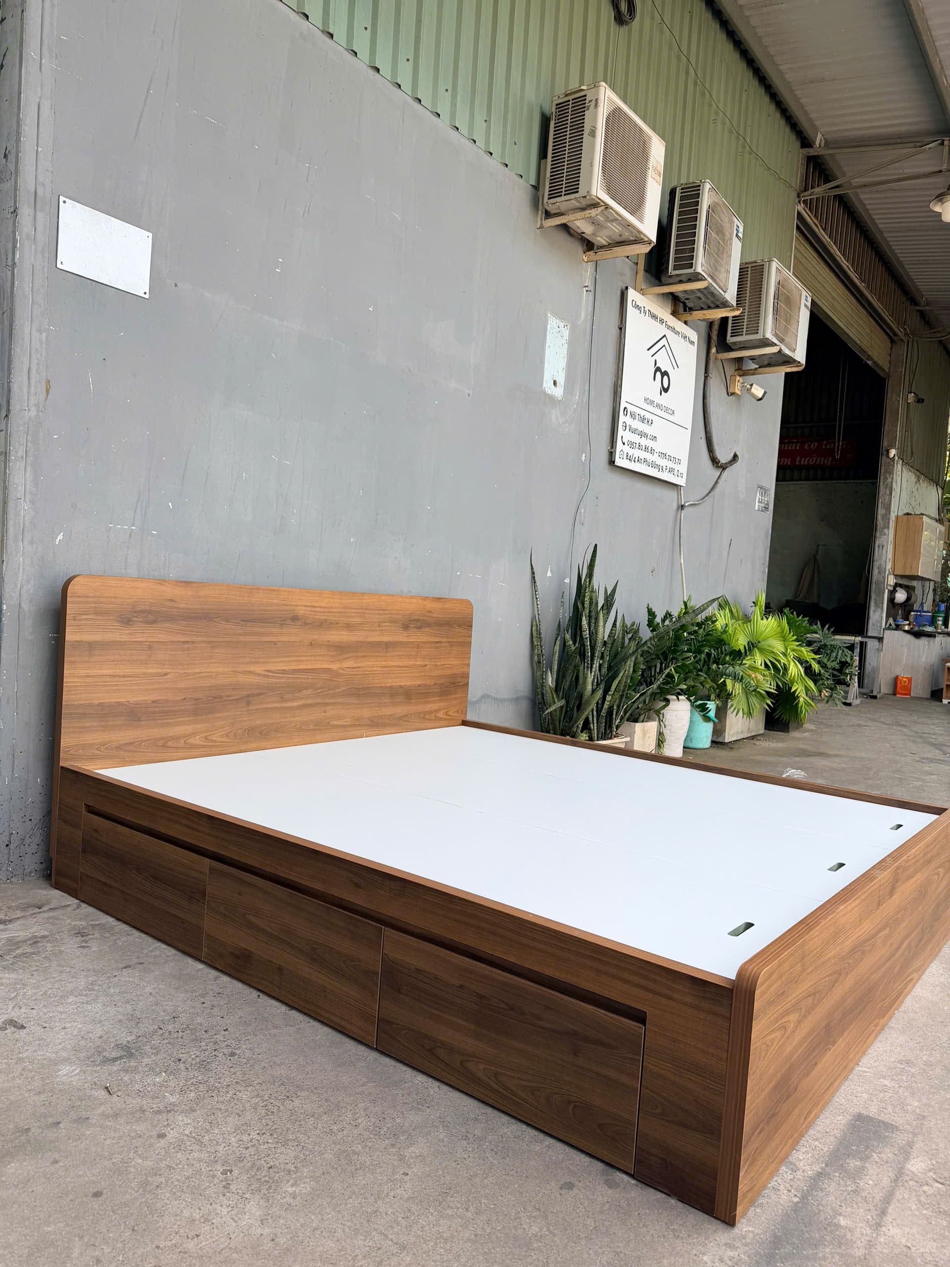 Giường ngủ MDF 1m8x2m màu nâu vân gỗ – Thiết kế bo cong hiện đại, có 3 ngăn kéo G25