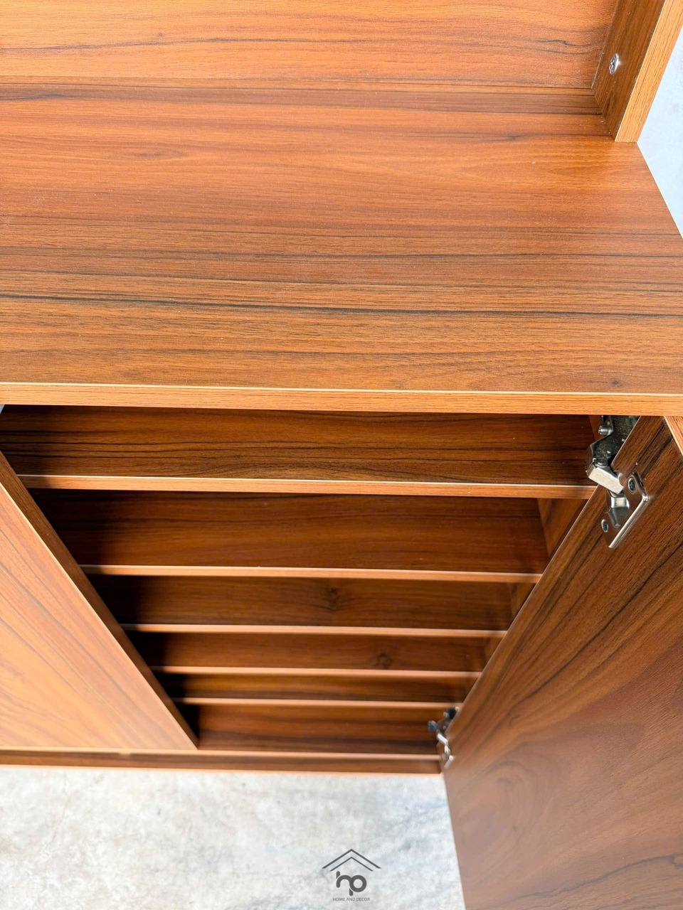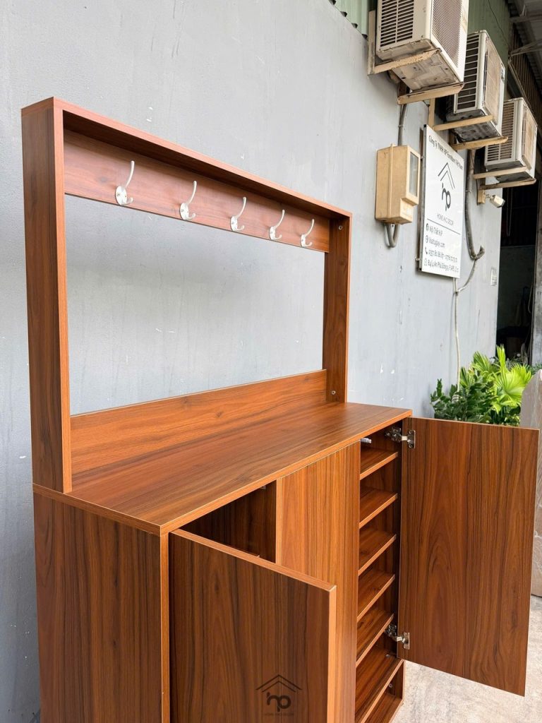 Tủ giày MDF chống ẩm màu nâu vân gỗ sang trọng, thiết kế 4 cánh mở (2 cánh nhỏ tiện lợi), nhiều ngăn chứa rộng rãi, tối ưu không gian gọn gàng.